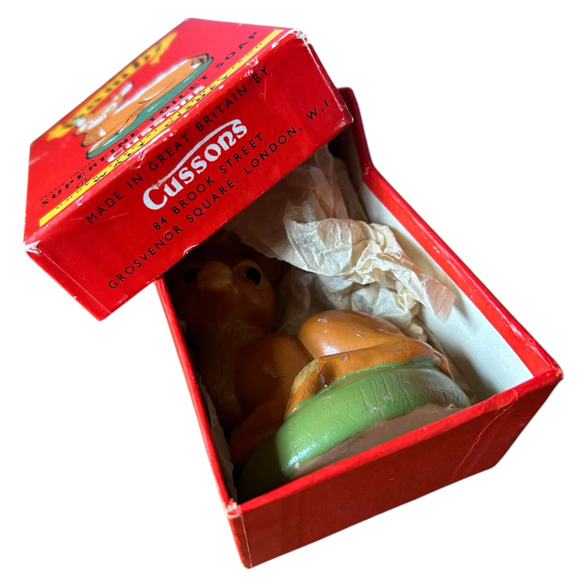 Super sweet vintage 1950’s Cussons Soap on the shape of Bambi. Unused, but there is a chip on Bambi’s ear. The cardboard box has minor wear consistent with age but it still in remarkable condition, approximately 11cm tall. Box is a little worn but no rips or tears, a fantastic item for collectors!